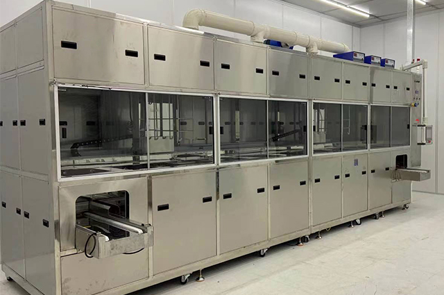 上料→超聲波清洗→高壓噴淋清洗→超聲波清洗→超聲波漂洗→風(fēng)切→熱風(fēng)烘干→真空干燥→下料